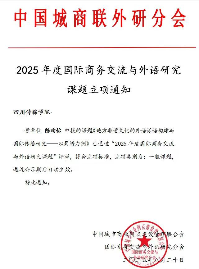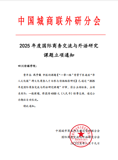 近日,从中国城商联外研分会传来喜讯,四川传媒学院区域国别国际传播研究院两位教师在“2025年度国际商务交流与外语研究课题”评审中双双立项,充分展现了我院教师在国际传播与区域国别研究领域的科研实力与学术风采。