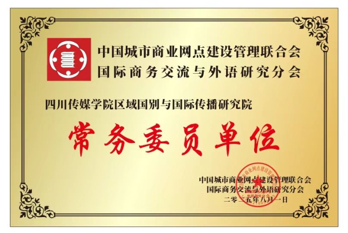 2025年8月1日,中国城市商业网点建设管理联合会国际商务交流与外语研究分会正式授予四川传媒学院区域国别与国际传播研究院“常务委员单位”荣誉称号,并颁发证书。