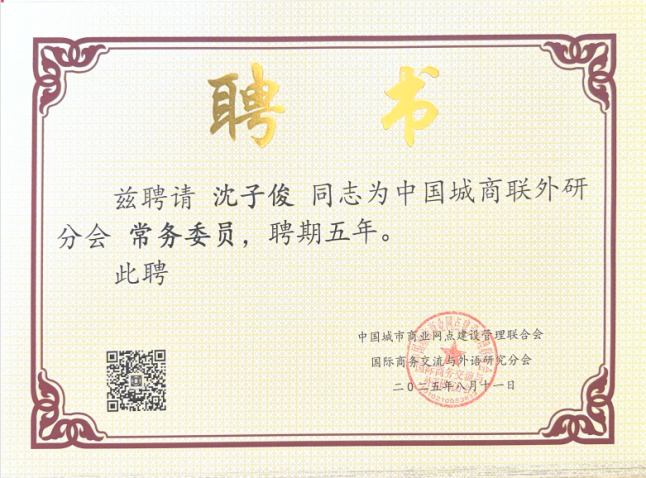 与此同时,分会还向我院颁发聘书,聘请沈子俊执行院长为中国城商联外研分会常务委员,聘期五年。