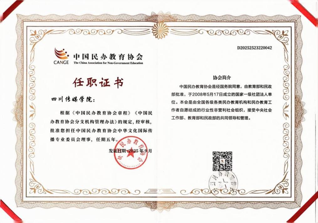 2025年9月19日,区域国别与国际传播研究院刘杨、陈昀怡老师赴北京参加中国民办教育协会中华文化国际传播专业委员会成立大会,此次大会由中国民办教育协会中华文化国际传播专业委员会主办,教育部中外语言交流合作中心支持,北京城市学院及民办高校国际中文教育实践与研究基地承办。旨在汇聚民办教育资源,助力民办高校国际传播相关专业学科的发展和人才培养,推动中华文化国际传播高质量发展。同时,我校当选为中国民办教育协会中华文化国际传播专委会理事。