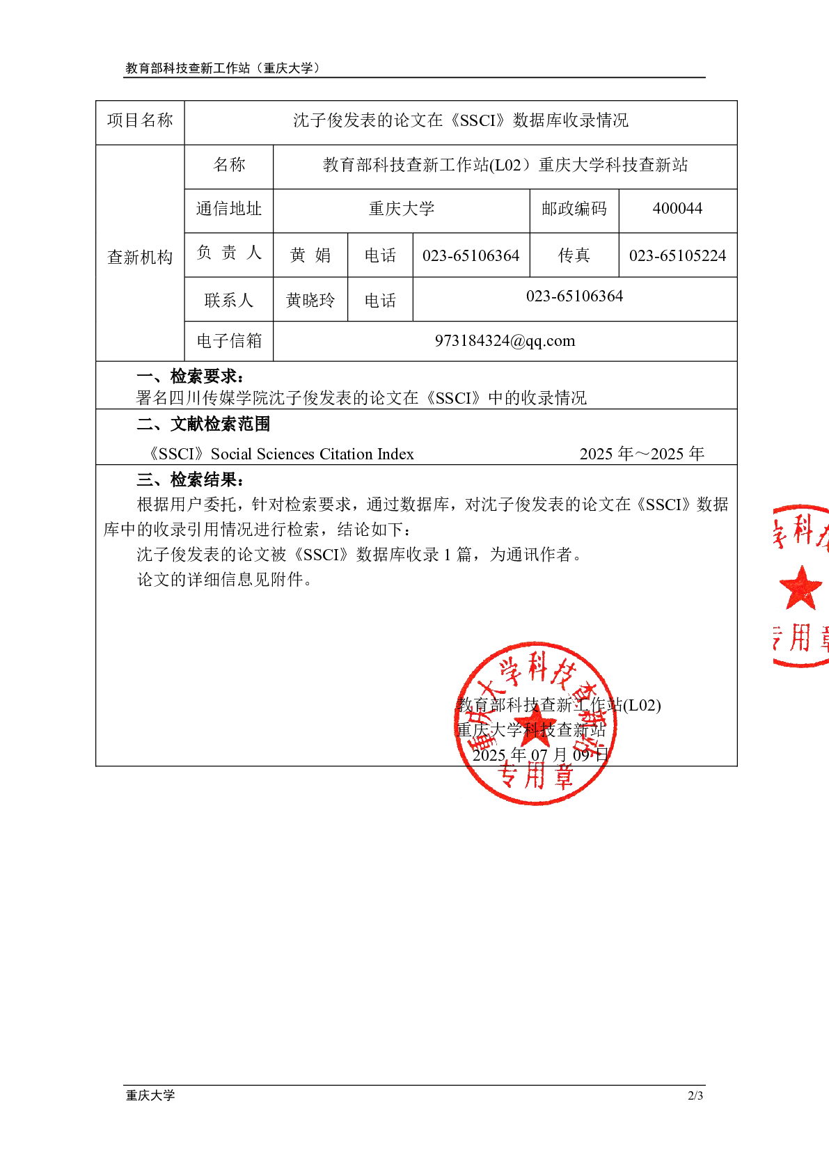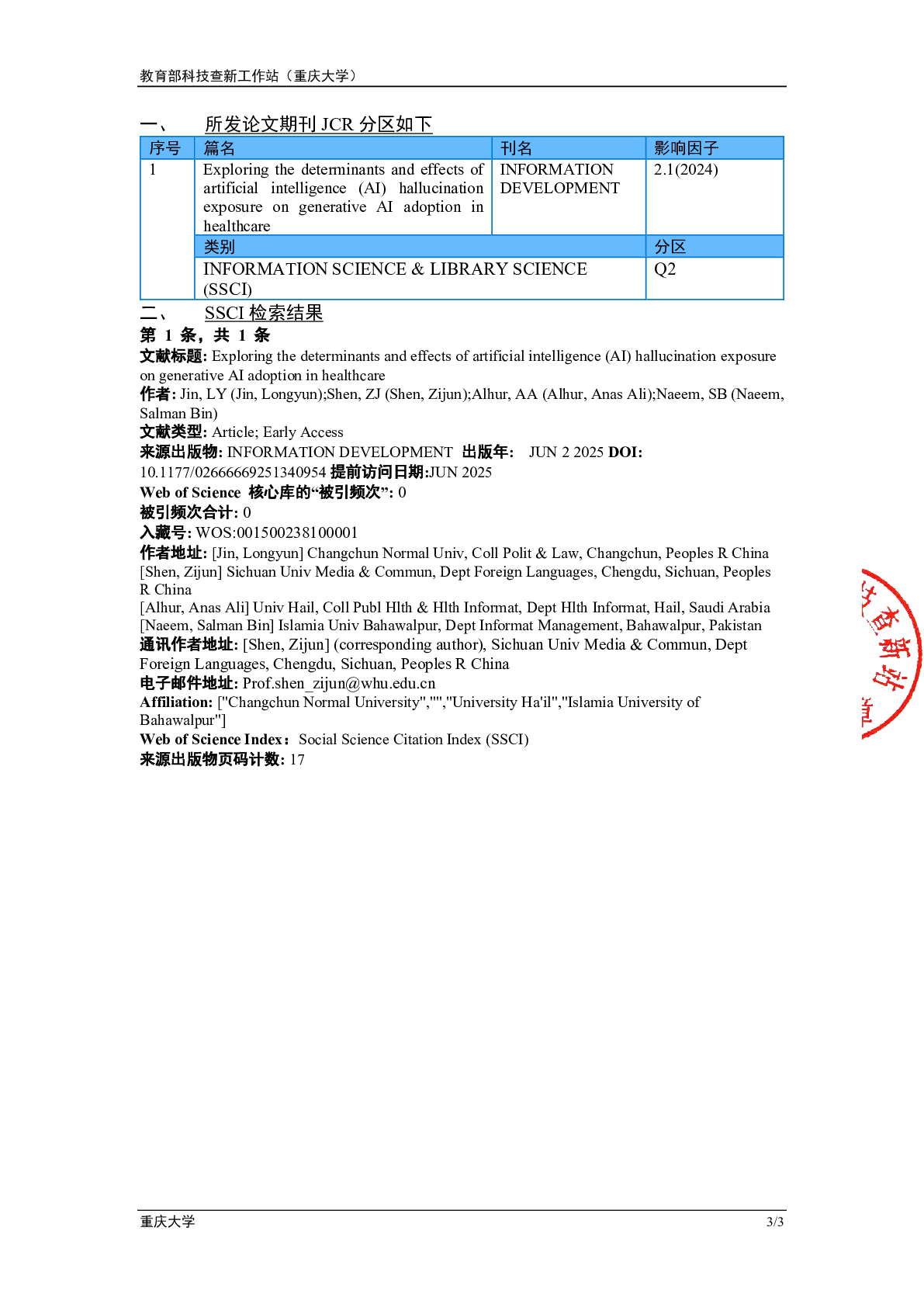 沈子俊发表的论文:Exploring the determinants and effects of artificial intelligence (AI) hallucination exposure on generative AI adoption in healthcare在《SSCI》数据库的收录情况