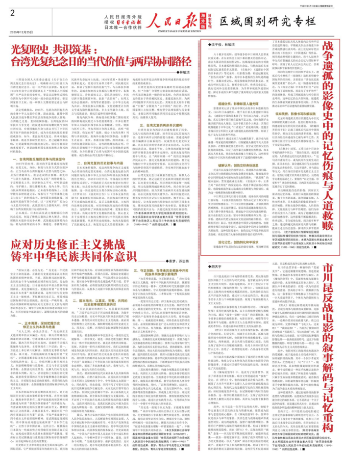 12月25日,《人民日报》海外版“区域国别研究专栏”刊发理论文章《战争遗孤的影像史中的记忆伤痕与人道救赎》,我校区域国别与国际传播研究院执行院长沈子俊副教授为第一作者,教育部长江学者特聘教授、南京师范大学区域国别研究院院长林敏洁教授为第二作者。该理论文章为2025年国家社科基金重大项目“世界历史视野下台湾地区人民抗日斗争的地位和贡献研究(1895—1945)”阶段性成果。